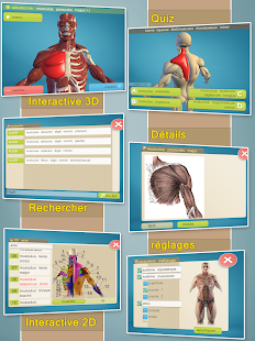 Learn human anatomy the easy way, view all muscles and bones in full 3D (rotate,zoom,pan)and interactively select individual muscles or bones to see their (Latin) name. Take the 3D quiz and test your knowledge. All muscles and bones also contain their own detailed information and their own detailed image, along with a link to their relevant Wikipedia page(were the information and images come from).